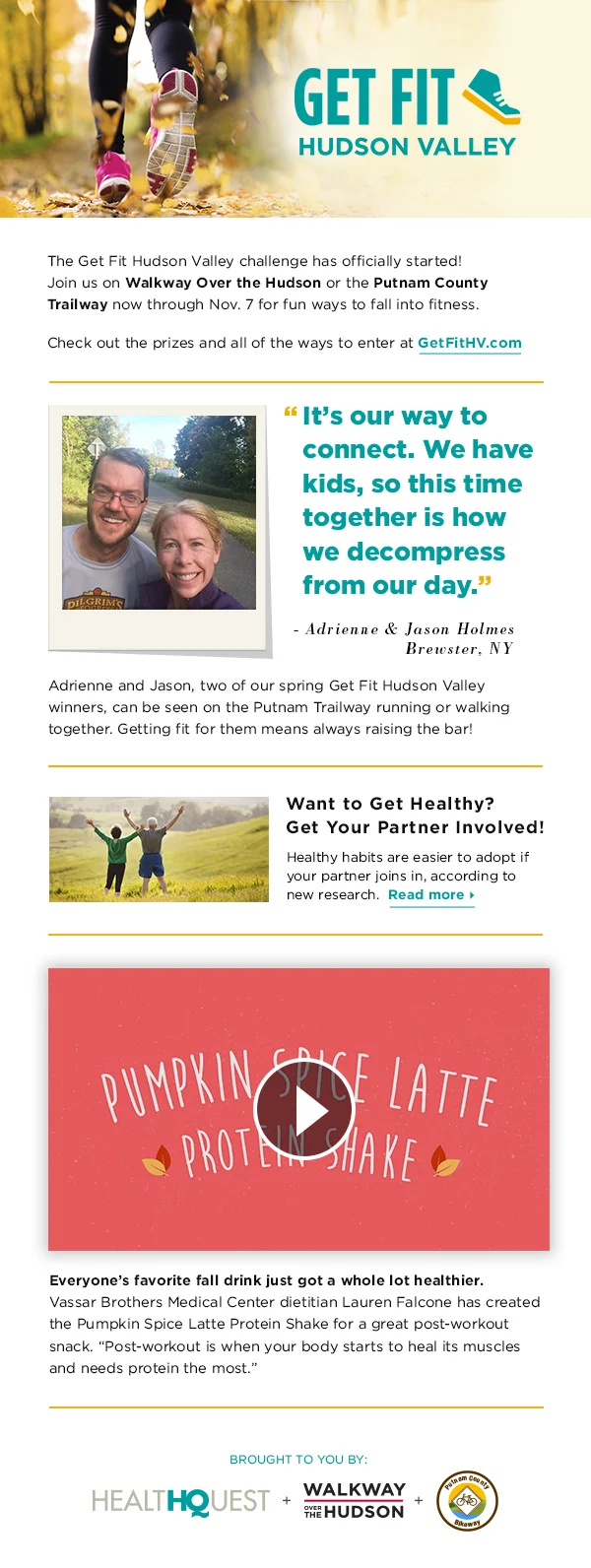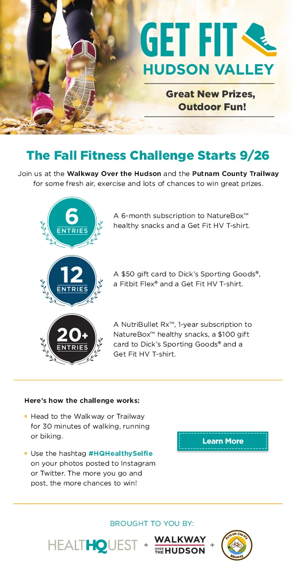 Get people up off the couch and outside to be active by logging their physical activity (walking, running, biking etc...) by using a custom social platform. Encourage people to post 'Healthy Selfies' to their social media pages using the hashtag #GetFitHV. Have local businesses, gyms, and parks around the Hudson Valley area join in and became designated Get Fit Hudson Valley check-in locations, and depending on how many entries were logged, enter participants in the running to win healthy prizes to motivate them to continue their health journey after the competition came to a close.